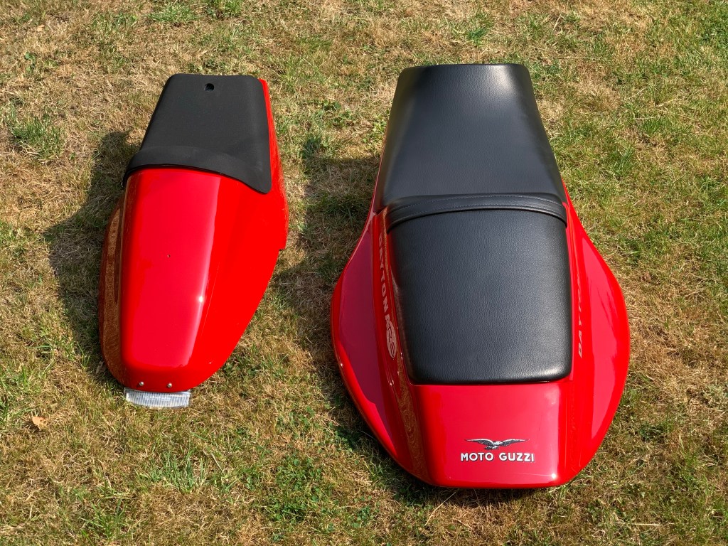 Unlike the earlier bike she is a glorious ‘Rosso Corsa’ red and like her predecessor had a wide derrière that may have been all the rage in the 90’s but detracted from the monumental, industrial scale, engine and gearbox. I trawled the internet and found Ghezzi Brian, the designers of the most beautiful Guzzi ever, the MGS-01, and ordered their seat conversion just as Italy went into lockdown.
