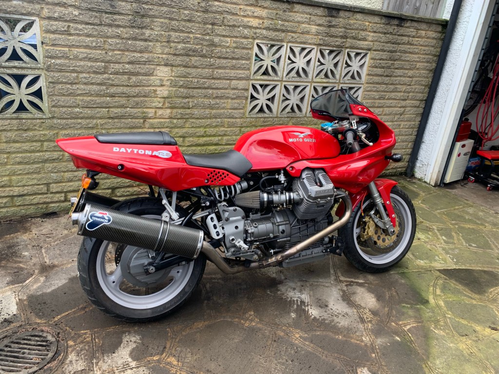 It’s not all bad, temptation lent on the doorbell and a friend of a friend hooked me up with the seller of a 1998 Guzzi Daytona RS with 9 thousand kilometres on the clock and a seriously inappropriate exhaust system. She was pretty and mean and meant something to me, I’d sold a similar bike, the 1100 Sport, back when I was married and the prospect of righting that appealed.